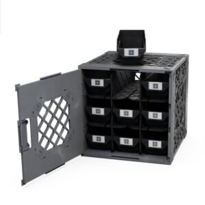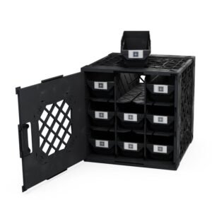 Highlights Heavy duty foam-filled polypropylene Nine small storage bins Divider and panels are included Configure with the door opening in