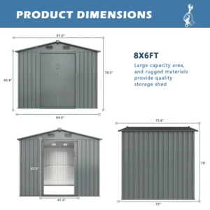 This spacious shed, measuring 8 by 12 feet, offers ample storage for your outdoor essentials. The sturdy metal construction ensures durability, while the double-hinged doors provide easy access. Perfect for organizing tools, equipment, and more, it’s an ideal addition to any backyard or garden.