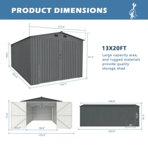 Welcome to our exclusive Metal Storage Shed 13x20ft – a storage marvel meticulously crafted for your unique needs. Reinforced with an anti-UV galvanized Steel Coating sheet, this shed exudes unparalleled strength, standing firm against the harshest elements and resisting corrosion. Embrace boundless space with its expansive 13x20ft dimensions, easily accommodating all your gardening tools, lawnmowers, and recreational gear. The clever inclusion of 4 vents ensures a fresh and moisture-free environment, preserving your belongings in top condition. Elevate your storage game with this purpose-built Metal Storage Shed – where security meets spaciousness in a class of its own. Trust in its reliability to safeguard your valuables with ease. Elevate your storage experience and safeguard your valuables with confidence. Your storage needs, are reimagined.