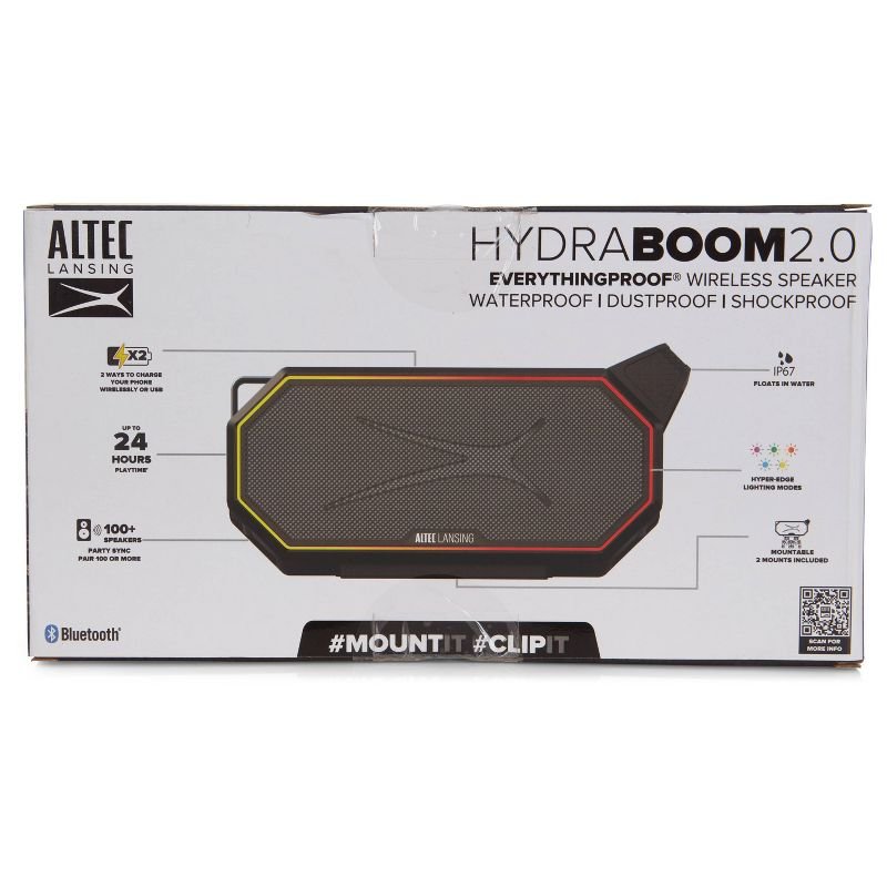 The Altec Lansing HydraBoom 2.0 EverythingProofâ„¢ speaker is the perfect party companion. With up to 16 hours of battery life plus built-in HyperEdge LED light modes, the party atmosphere and music will be hard to top! Qi Wireless charging keeps not only your phone but the party alive, simply drop and charge a Qi-compatible device atop the speaker and watch it power up! Don’t have a phone with wireless charging – the HydraBoom 2.0 comes equipped with a USB smartphone charger for added functionality. With an IP67 EverythingProofâ„¢ rating, built-in speaker mounts, carabiner clip, and carry handle, take the HydraBoom 2.0 anywhere. Party Sync allows you to pair 100+ HydraBooms together for that surround sound excitement. The party just got better with Altec Lansing!