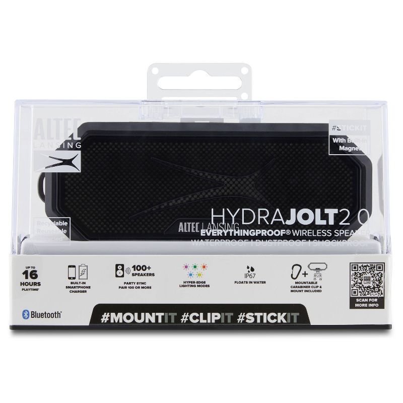The Altec Lansing HydraJolt 2.0 EverythingProof™ Speaker is a powerful, portable wireless speaker. It is waterproof, dustproof, shockproof and it floats in water with it’s IP67 EverythingProof™ rating. A built-in smartphone charger and up to 16 hours of battery make sure you’re connected during every adventure. The HydraJolt 2.0 has a built-in speaker mount, carabiner, and magnet to take your tunes on the go! Party Sync allows you to pair 100+ HydraJolts together for more sound! HyperEdge LED light modes will brighten your sound for added fun.