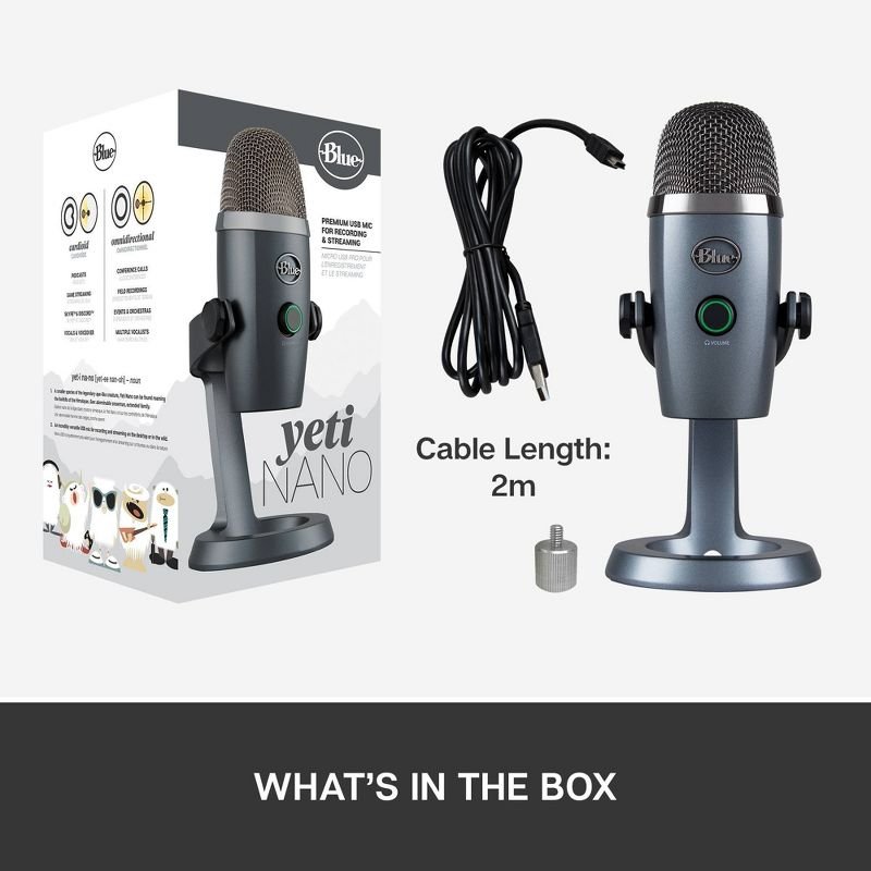 Yeti Nano is a premium USB microphone designed for broadcast-quality podcasting, YouTube productions, game streaming, Skype calls, and voice over work. Inspired by the #1-selling Blue Yeti microphone, Yeti Nano features 24-bit sound quality, a compact design, and plug ’n play operation for instant streaming with your Mac or PC. The premium finish looks great on camera and on any desktop. With a no-latency headphone output and controls for headphone volume, mic mute, and pickup pattern, Yeti Nano is the essential mic for today’s broadcasters.