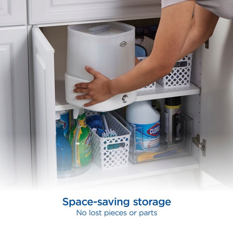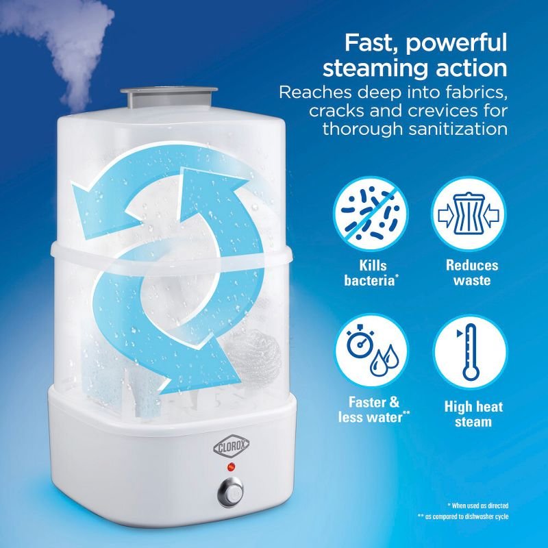 Sanitize at your convenience with fast, powerful steaming action. The Cloroxâ„¢ 2-Tier Steam Sanitizer kills 99.999% of bacteria in minutes*. Use it to sanitize kitchen sponges, dish cloths, brushes, reusable water bottles, kitchen utensils and more with steam. It reaches deep into fabrics, cracks & crevices for thorough sanitization, and it only needs 1.4 to 3.4 oz. (40-100 ml) of water to create hot, sanitizing steam. You’ll be able to keep your kitchen utensils and cleaning tools sanitized and ready to use — no need to throw away your sponges too soon or use wasteful paper towels to clean up messes. It is faster and uses less water than a dishwasher cycle, so it’s time-saving and convenient. The versatile and adjustable 2-tier capacity lets you sanitize a variety of items, and it’s easy to use. Simply fill the water reservoir, load items and press start — it automatically turns off when sanitizing is complete. When you’re finished, the space-saving nesting design fits in your cabinet for easy storage. Includes 2 tiers, 4 removable pegs, adjustable rack and steaming base.