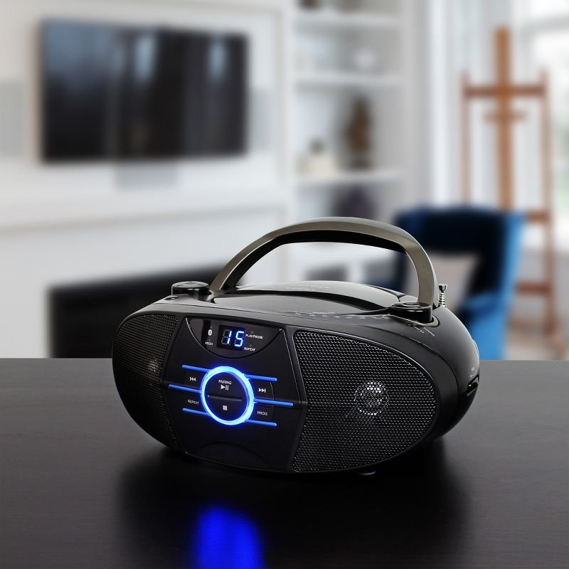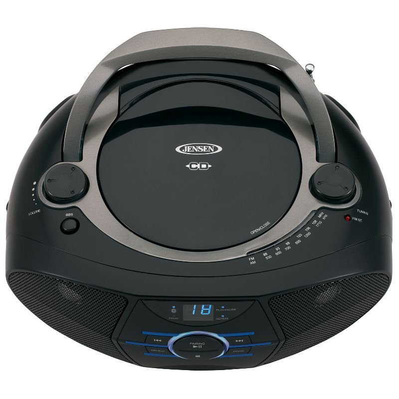 The JENSEN® CD-560 is a stylish portable stereo boombox with Bluetooth® connectivity, a top loading CD player that supports CD-R/RW discs, and AM/FM radio. Connect your Apple®, Android™, or Digital Media Player device via Bluetooth and wirelessly stream music or any other audio content to the speakers from up to 33 feet away. The unit also features a blue LED track display for the CD details and front mounted blue ambient lighting. The CD player controls include Skip/Search, Forward, Back, and Repeat buttons, along with Programmable Memory. This great, portable compact disc player has a foldable carrying handle, telescopic antenna, and AUX line-in jack for connecting your iPod®, MP3, or other digital audio player. Requires 120V AC/60Hz or uses eight (8) “C” batteries to operate.