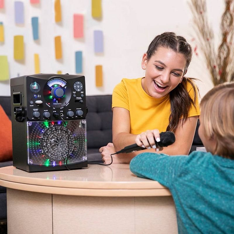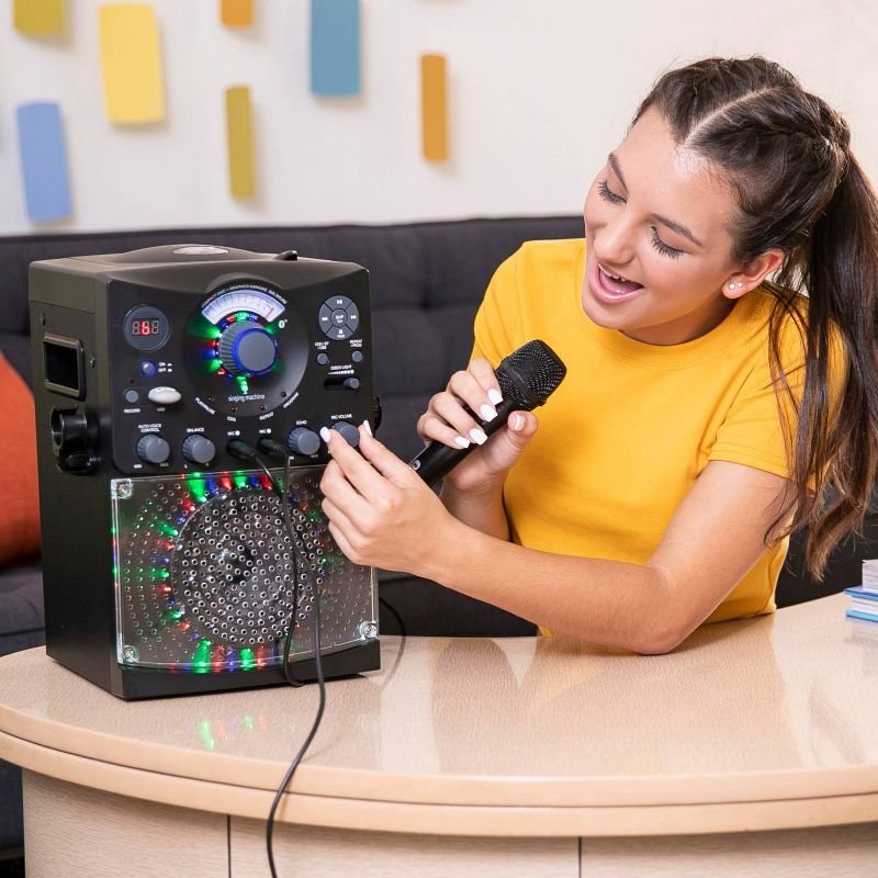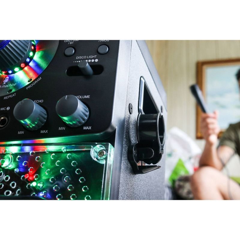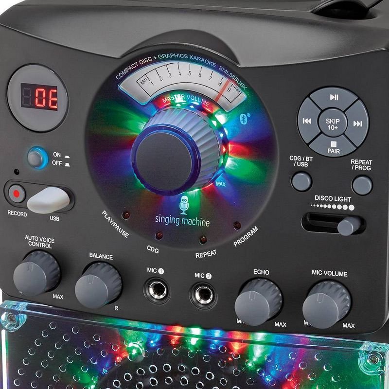Host a dance party with the SML385UBK Singing Machine Bluetooth Karaoke system featuring a top loading CD player that plays music CDs and CD + Graphics. Wirelessly stream digital audio from any Bluetooth compatible device or plug in your USB to listen to your favorite jam or to record your performance! Hi-Fi LED disco lights effect set the perfect party ambience.