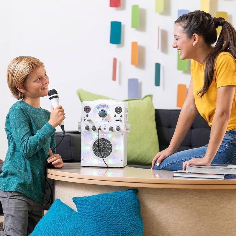 Host a dance party with the SML385UW Singing Machine Bluetooth Karaoke system featuring a top loading CD player that plays music CDs and CD + Graphics. Wirelessly stream digital audio from any Bluetooth compatible device or plug in your USB to listen to your favorite jam or to record your performance! Hi-Fi LED disco lights effect set the perfect party ambience.