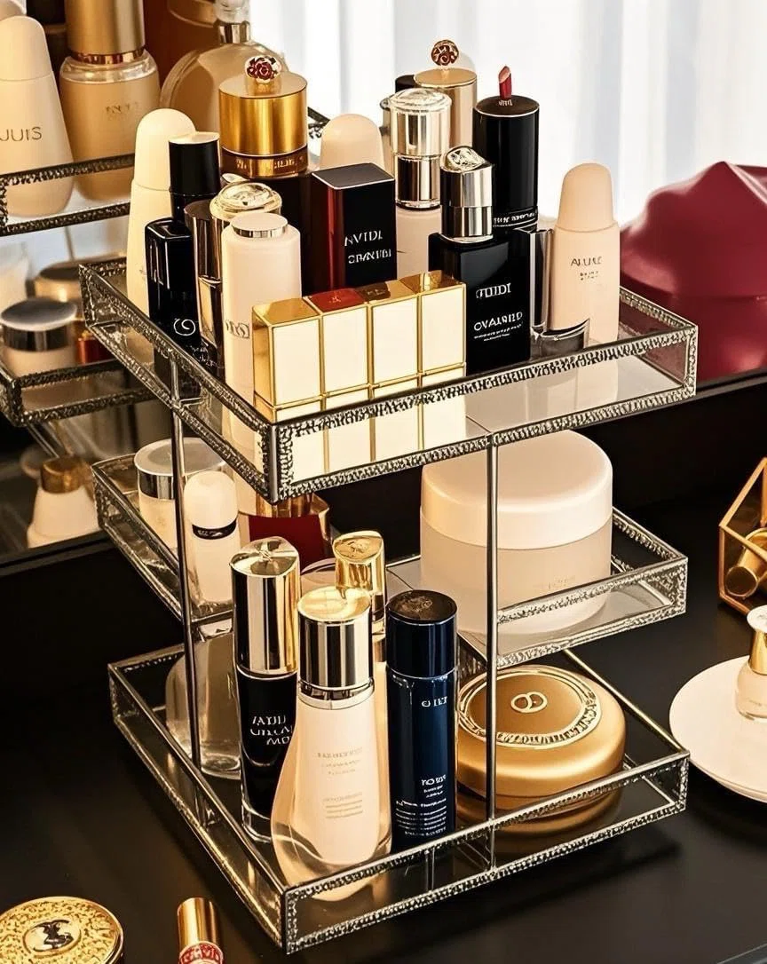 4layer and Spin design can hold many items while take small space,Glass material with smooth cutting and weld firmly by handmade,High quality ,beauty and easy clean,It is perfect for holding perfume/skincare/makeup and jewelry,DIY more new uses for yourself,large bottle or small pefume/lipstick and ect, all can accommodate